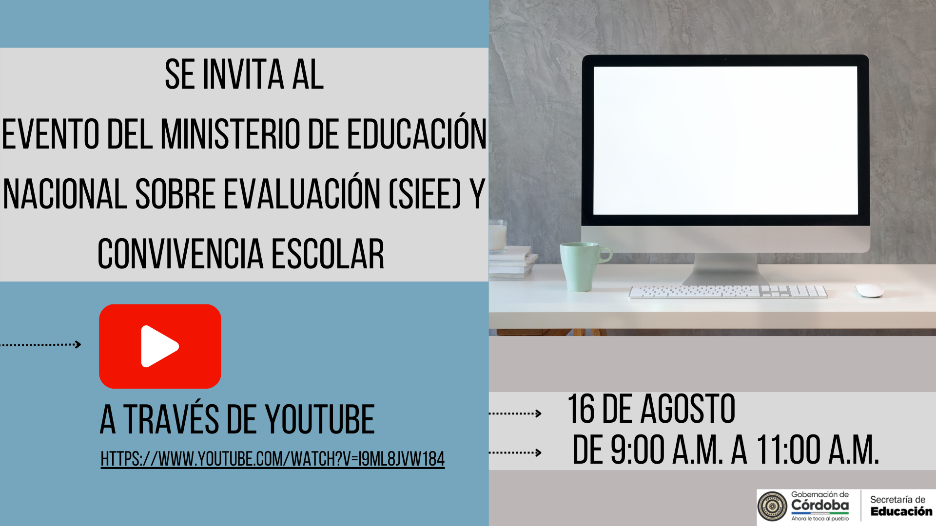 De manera atenta desde la Secretaría de Educación Departamental se informa que el Equipo de Evaluación de la Subdirección de Referentes y Evaluación de la Calidad Educativa del Ministerio de Educación Nacional -MEN, realizará un evento a través de la plataforma YouTube, sobre la evaluación, específicamente desde el SIEE y la convivencia escolar como apuestas para el desarrollo integral. Por lo cual, se solicita respetuosamente a todos los establecimientos educativos que se vinculen a este evento que se desarrollará el día 16 de agosto del año en curso de 9:00 a.m. a 11:00 a.m.