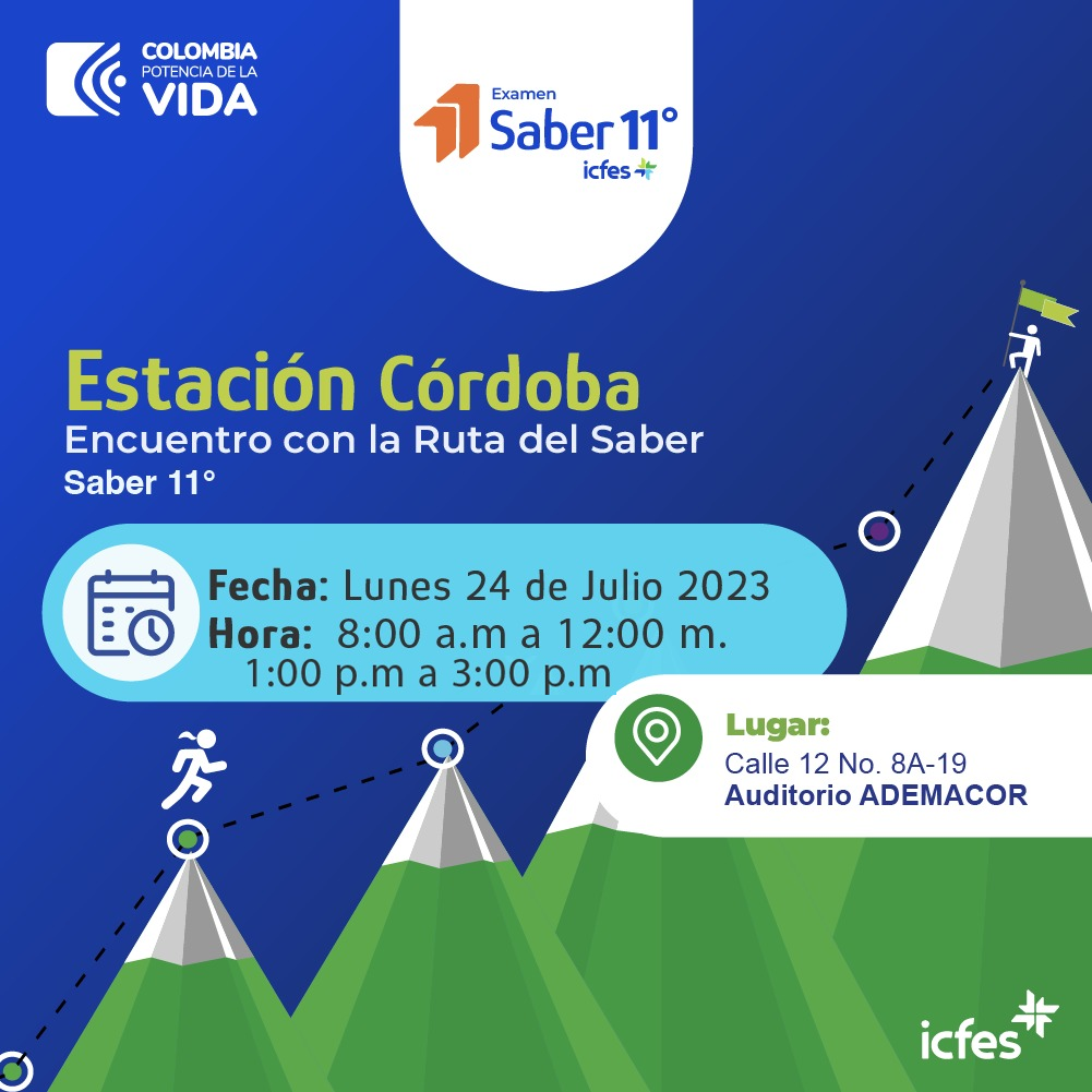 En el marco de la estrategia de divulgación de la Ruta del Saber 2023, el ICES desarrollará un encuentro regional presencial dirigido a los rectores, directores rurales o encargados del análisis e interpretación de resultados de los establecimientos educativos de los municipios no certificados del Departamento de Córdoba, en el que se presentará información que permita comprender los resultados de los exámenes que aplica el ICFES. En atención a lo anterior, esta Secretaria se permite solicitar respetuosamente que participen en este encuentro que se desarrollará el día 24 de julio, en el horario de 8:00 a.m. a 12:00 m. y de 1:00 p.m. a 3:30 p.m., y tendrá lugar en el auditorio de ADEMACOR ubicado en la dirección Calle 12 # 89-19.