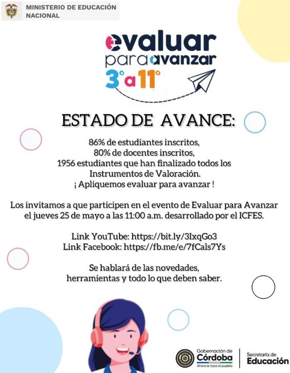 En el marco de la implementación de la política Evaluar para Avanzar, la Secretaría de Educación Departamental se permite informar que a corte del 23 de mayo del año 2023 Córdoba cuenta con un avance del 86% de estudiantes inscritos, un avance del 80% de docentes inscritos y un avance de 1956 estudiantes que han finalizado la aplicación de todos los instrumentos de valoración, frente al total de estudiantes inscritos.