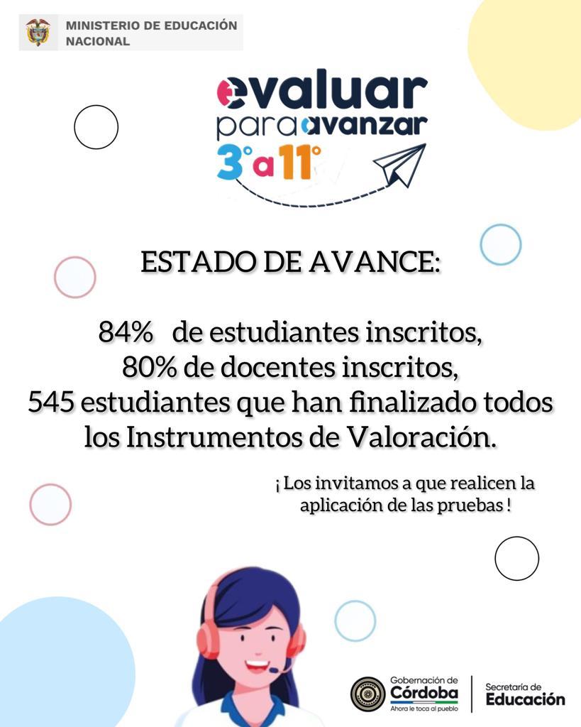 En el marco de la implementación de la política Evaluar para Avanzar, la Secretaría de Educación Departamental se permite informar que a corte del 15 de mayo del año 2023 Córdoba cuenta con un avance del 84% de estudiantes inscritos, un avance del 80% de docentes inscritos y un avance de 545 estudiantes que han finalizado la aplicación de todos los instrumentos de valoración, frente al total de estudiantes inscritos.