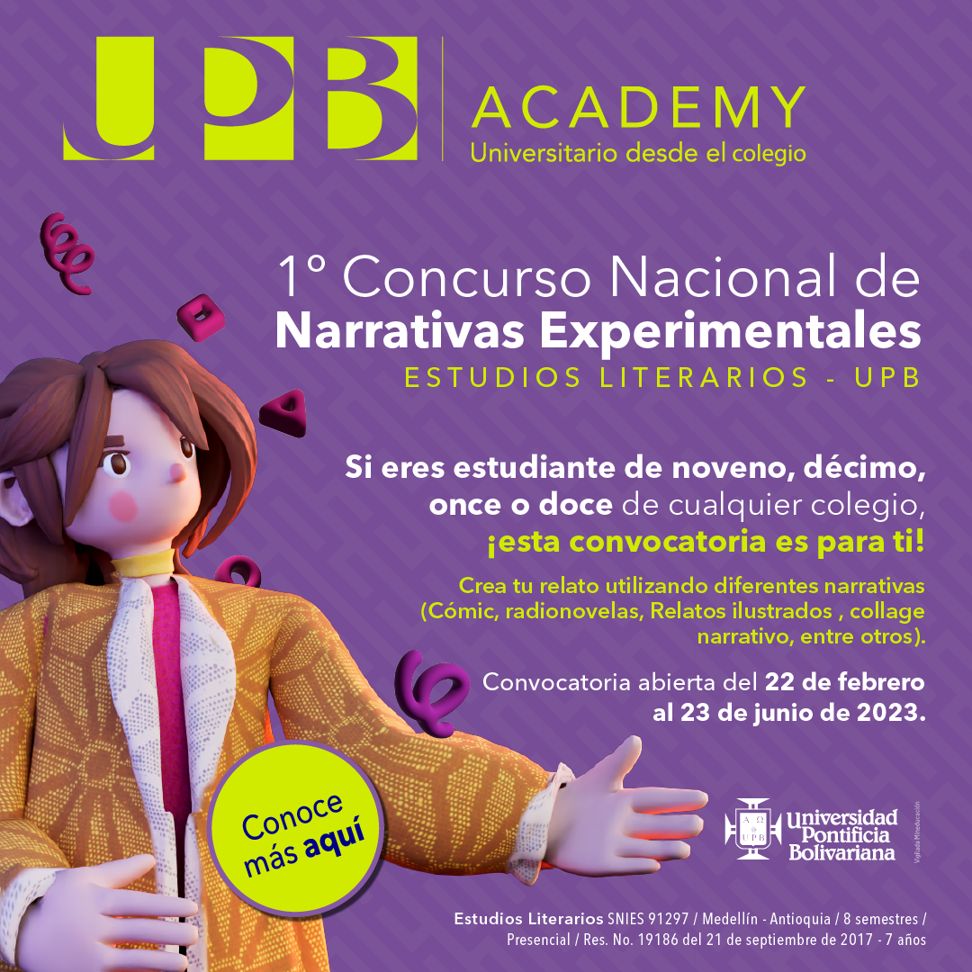 En el marco del programa de pregrado en Estudios Literarios de la Universidad Pontificia Bolivariana de Medellín - Antioquia, y en articulación con la Secretaría de Educación Departamental, es lanzado el I Concurso Nacional de Narrativas Experimentales, una invitación a los estudiantes de grados 9°, 10°, 11° y 12° a crear e indagar por las infinitas posibilidades que tienen de contar historias.