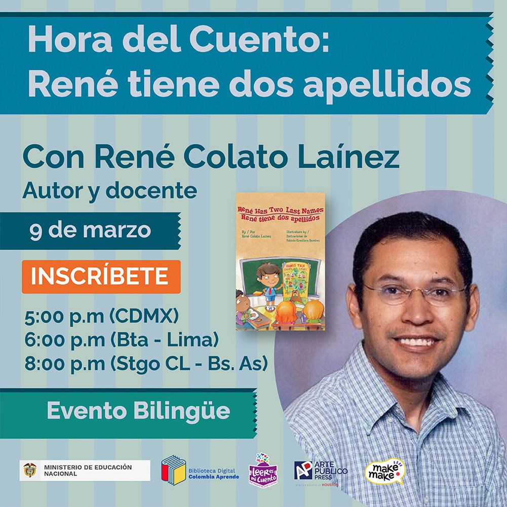 En el marco del Plan Territorial de Lectura, Escritura y Oralidad “LEO para mi vida” 2022-2024 de la ETC Córdoba, el equipo de la Biblioteca Digital “Colombia Aprende” y el Plan Nacional de Lectura, Escritura y Oralidad, en articulación con la Secretaría de Educación Departamental INVITA a la actividad HORA DEL CUENTO BILINGÜE con René Colato Laínez el próximo jueves 9 de marzo a las 6:00 pm en modalidad vrtual.