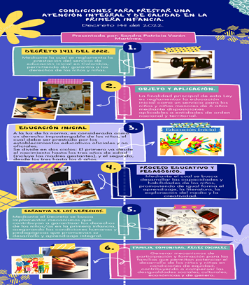 Con la expedición del Decreto 1411 de 2022, el Ministerio de Educación Nacional establece las condiciones para que todos los servicios de educación inicial del país, tanto oficiales como no oficiales, se brinden en el marco de la atención integral y garanticen un servicio de calidad, centrado en la promoción del desarrollo de los niños y niñas menores de 6 años; así como hace explicito la importancia de brindar atención a las mujeres gestantes con el fin de fortalecer el rol de la familia en los primeros años de vida.