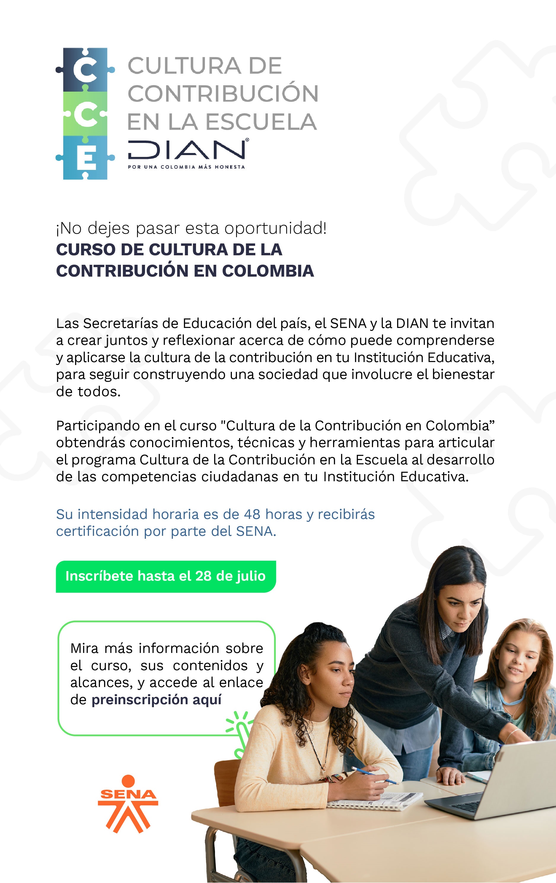De manera atenta me permito compartirles las piezas publicitarias para promocionar el curso de Cultura de la Contribución con el SENA para el mes de agosto; fecha de cierre de las inscripciones, 28 de julio de 2022.