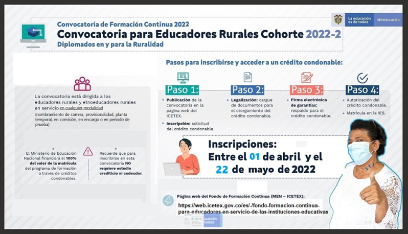El Ministerio de Educación amplió el proceso de inscripción hasta el 22 de mayo de 2022, para la convocatoria que invita a 1550 educadores rurales y etnoeducadores con nombramiento de carrera, provisionalidad, planta temporal, en comisión, en encargo o en periodo de prueba, a inscribirse para cursar diplomados sobre Educación inclusiva, Etnoeducación, Gestión escolar, Educación Inicial, Currículos Flexibles, Modelos Educativos Flexibles, Uso de Tics Ciudadanía y Sistematización. Estos programas de formación buscan contribuir a generar prácticas pedagógicas innovadoras y aportar a la gestión educativa institucional.
