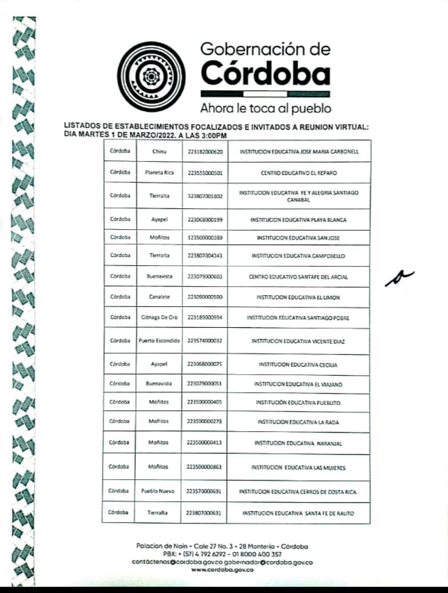 El Ministerio de Educación Nacional a través de la SED – Córdoba, convoca a una reunión virtual para los rectores y directores rurales de los establecimientos educativos oficiales focalizados por el Convenio MEN – Fundación UNITED WAY Colombia, con el fin de iniciar orientaciones al proceso de acompañamiento a Jornada única y Gestión de la Educación Inicial año 2022.
