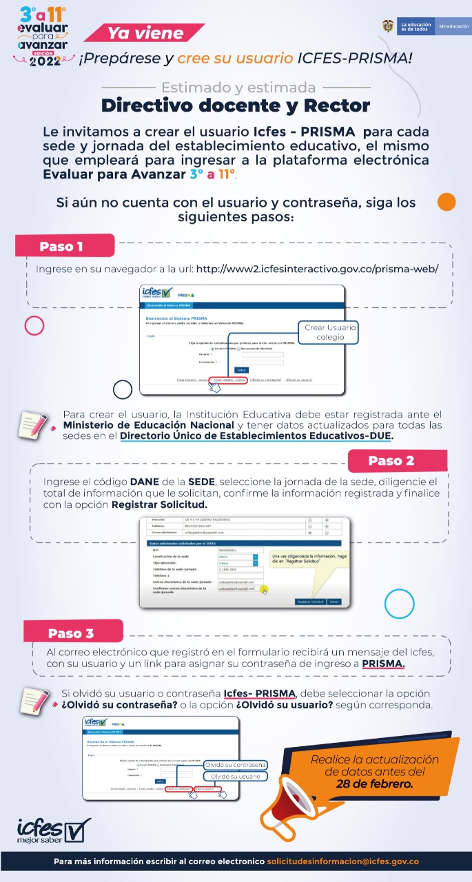 Actualmente nos encontramos en etapa de alistamiento y preparación para la implementación de Evaluar para Avanzar 3° a 11°, agradecemos su apoyo para la creación de su usuario icfes-Prisma para cada una de las sedes y jornadas del establecimiento educativo que dirigen, para estar listos una vez inicie el proceso de inscripción en la plataforma electrónica, para lo cual pueden ingresar a http://www.icfesinteractivo.gov.co/prisma-web/