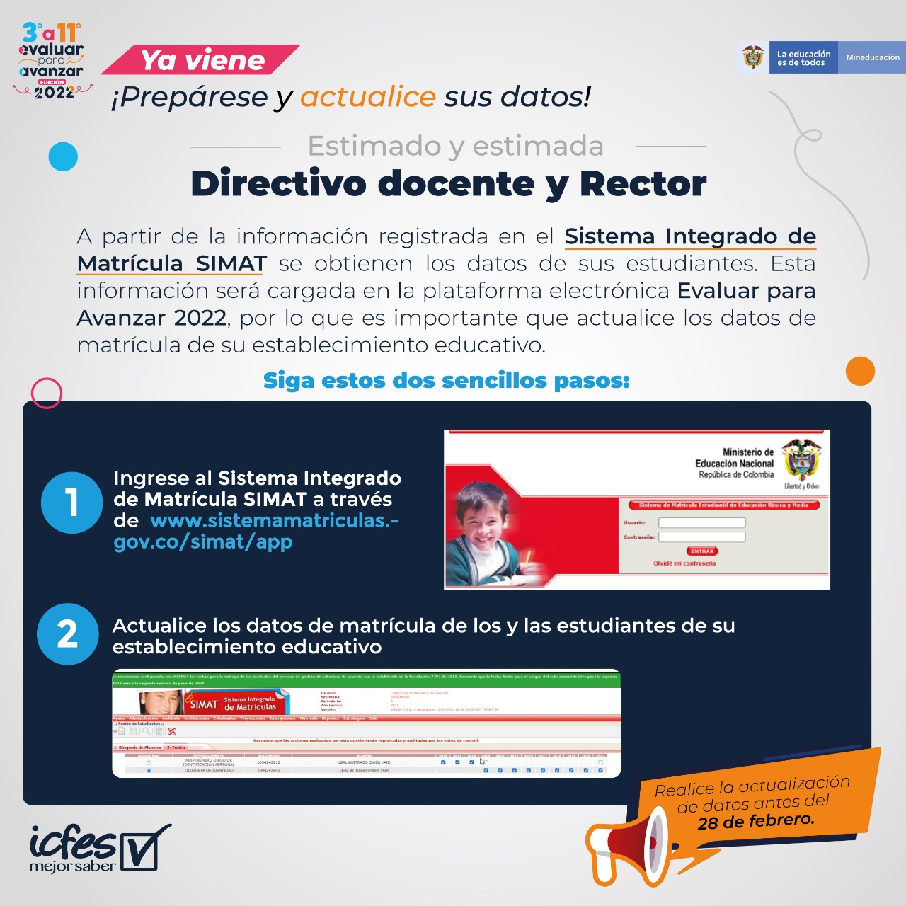 Actualmente nos encontramos en etapa de alistamiento y preparación para la implementación de Evaluar para Avanzar 3º a 11º 2022, agradecemos su apoyo para convocar y motivar a los directivos docentes y rectores que hacen parte de su entidad territorial, para que antes del 28 de febrero, realicen el proceso de actualización de información en el Sistema Integrado de Matrícula SIMAT y en el Directorio Único de Establecimientos - DUE, esta información será el insumo para la plataforma electrónica Evaluar para Avanzar 3º a 11º.