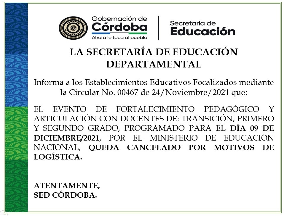 La SED – Córdoba se permite informarles que el Evento de Fortalecimiento Pedagógico y Articulación para: 1 docente de Transición, 1 docente de Primaria y 1 docente de Segundo Grado de los EE focalizados, programado por el Ministerio de Educación Nacional para el día 9 de diciembre de 2021, queda CANCELADO por el MEN, por motivos de fuerza mayor con la logística en Montería, pues lamentablemente no fue posible encontrar un espacio acorde con los requerimientos de la metodología necesaria para el desarrollo de este, pues debido a la época navideña, los sitios de eventos están comprometidos.
