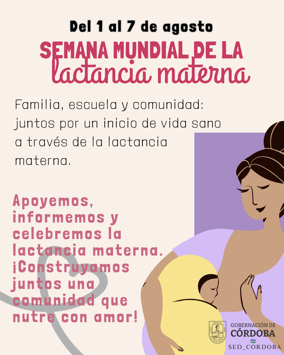 En el marco de la Semana Mundial de la Lactancia Materna (1 al 7 de agosto), desde el area de Calidad Educativa de la Secretaría de Educación de Córdoba invitamos a toda la comunidad académica a unirse en la promoción y el apoyo a la lactancia materna como un acto fundamental de amor, salud y desarrollo integral. Incentivar esta práctica desde nuestras instituciones educativas fortalece a las familias y contribuye a la construcción de una sociedad más saludable y consciente.