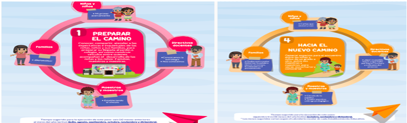 Este 4o. Paso: Hacia el nuevo camino. Se da durante los meses finales del año de trabajo (octubre, noviembre y diciembre). Se deben generar espacios para el encuentro entre las niñas, niños de un grado a otro y entre sus maestras y maestros, para verse, escucharse y conocerse, realizar recorridos por las aulas y dependencias del E.E,