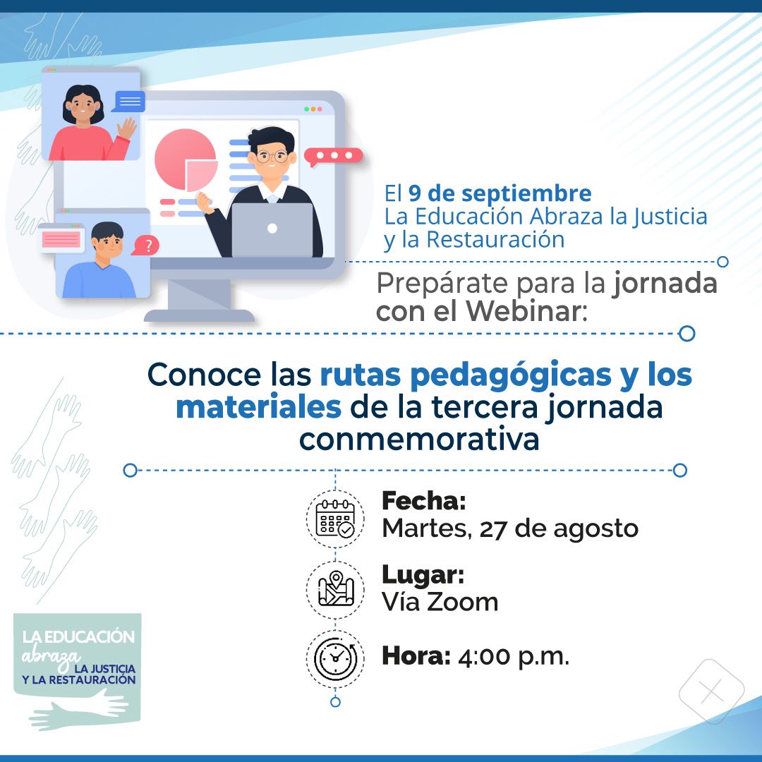 WEBINAR "CONOCE LAS RUTAS PEDAGÓGICAS Y LOS MATERIALES DE LA TERCERA JORNADA CONMEMORATIVA - LA EDUCACIÓN ABRAZA LA JUSTICIA Y LA RESTAURACIÓN".