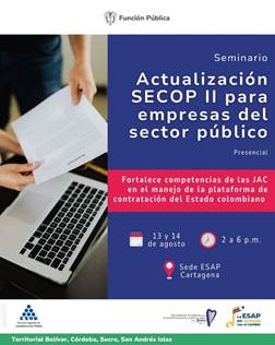 Seminario PRESENCIAL en SECOP II y RUC dirigido a las JAC – Sede Cartagena Lugar de realización: Auditorio ESAP Cartagena Cierre de inscripciones: 13 agosto 2024 Inicio y fin de la capacitación: 13 y 14 agosto 2024 Hora: 2:00 PM – 6:00 PM |