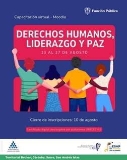 Curso VIRTUAL sobre Derechos Humanos y Liderazgo para la Paz Intensidad horaria: 40 horas Lugar de realización: MOODLE - ESAP Cierre de inscripciones: 10 agosto 2024 Inicio y fin de la capacitación: Del 13 al 27 agosto 2024 |
