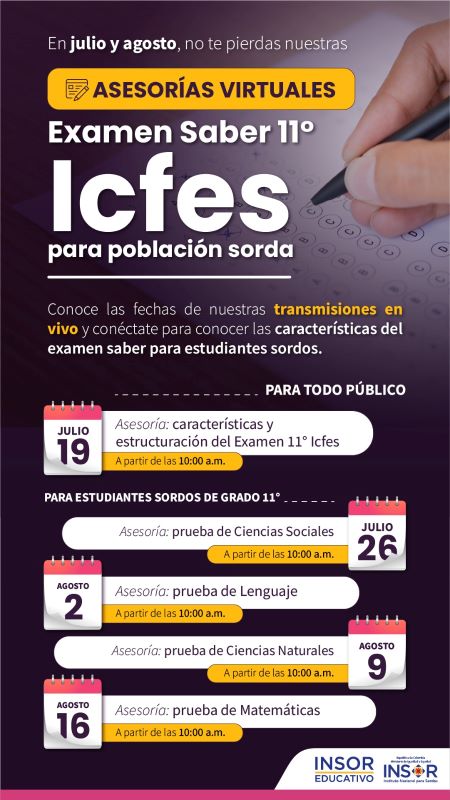 Una de nuestras líneas de cualificación diseñadas en el marco de este programa, tiene como objetivo difundir y fortalecer los conocimientos con relación a los ajustes razonables y características actuales de las Pruebas Saber 11 para estudiantes sordos. En este orden de ideas hemos diseñado un set de 5 encuentros virtuales de cualificación previos a la presentación del Examen Saber 11 2024.