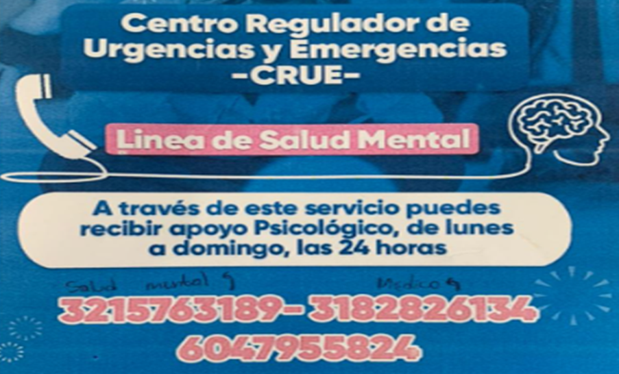 Dado el aumento de casos dentro de los establecimientos educativos que afectan la salud mental de los integrantes de las comunidades educativas, la SED Córdoba se une a la secretaria de desarrollo de la salud en cabeza de los Centro Reguladores de Urgencias y Emergencia CRUE y comparte con ustedes las líneas telefónicas de atención de SALUD MENTAL, con disponibilidad de Lunes a Domingo. A través de este servicio podrán recibir apoyo psicológico, gratuito las 24 horas del día.