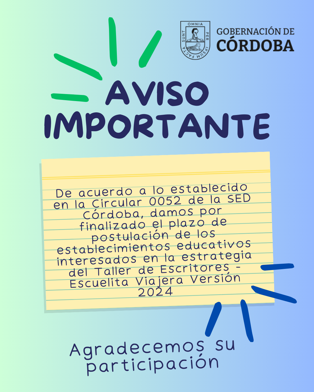 En el marco de la ejecución del Plan Territorial de Lectura, Escritura, Oralidad y Bibliotecas Escolares de la ETC Córdoba “LEO para mi vida”, la Secretaría de Educación Departamental INVITA a docentes apropiados del desarrollo de competencias de lectura y escritura en su Establecimiento Educativo, a POSTULARSE PARA SER FOCALIZADO EN LA ESTRATEGIA “Taller de Escritores de la Escuelita Viajera”, un programa lúdico-pedagógico de sensibilización y formación literaria, formulado como plan estratégico lecto-escritor para el mejoramiento de las habilidades comunicativas y del lenguaje, y el fomento de la expresión creativa de los estudiantes de secundaria.