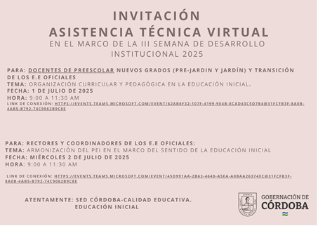 La Secretaría de Educación Departamental, a través del área de Calidad Educativa, CONVOCA a docentes de inglés y docentes designados de básica primaria, a asistencia técnica en la construcción de Planes Institucionales de Bilingüismo, como parte de las acciones dentro del marco de la estrategia “ENGLISH OUT” de la SED Córdoba.