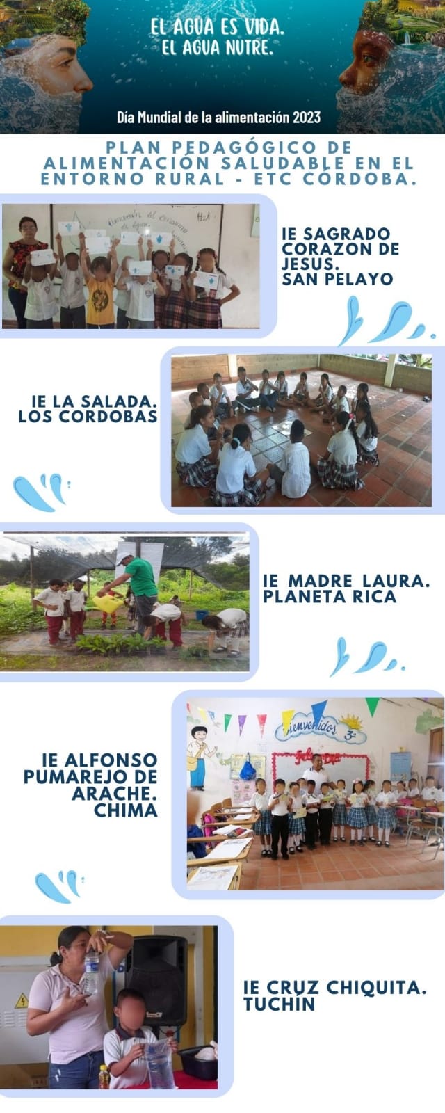 Actividades desarrolladas en el marco de la ejecución del Plan Pedagógico de Alimentación Saludable en el Entorno Rural, en los Establecimientos Educativos del Departamento de Córdoba, para conmemorar el Dia Mundial de la Alimentación 2023, cuyo lema es “el agua es vida, el agua nutre”.