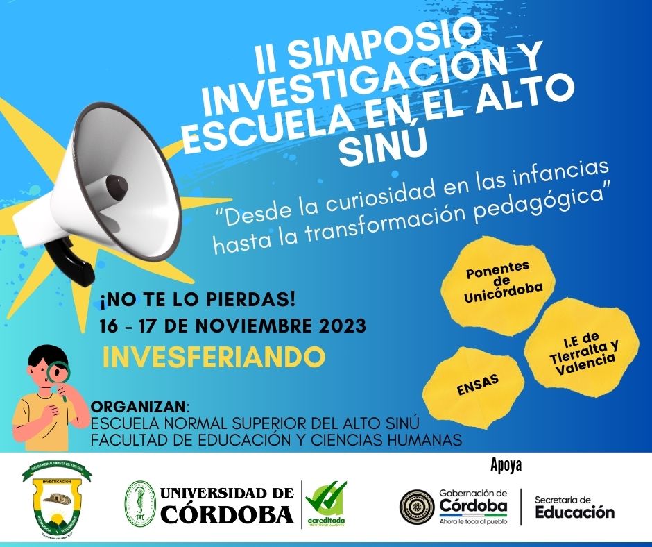 La Institución Educativa Agroecológica Nuevo Oriente, ahora Escuela Normal Superior del Alto Sinú y la Universidad de Córdoba con apoyo de la secretaria de Educación Departamental de Córdoba extiende la invitación para que los Establecimientos Educativos Oficiales de los municipios de Tierralta y Valencia participen del “II SIMPOSIO INVESTIGACION Y ESCUELA EN EL ALTO SINÚ”, bajo el slogan “Desde la curiosidad en las infancias hasta la transformación pedagógica”.