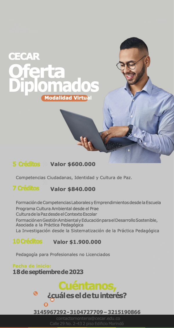 La Corporación Universitaria del Caribe - CECAR, PRESENTA oferta de diplomados 2023-2 dirigido a los docentes del departamento de Córdoba. Los interesados, comunicarse a los números de contacto relacionados en la infografía.