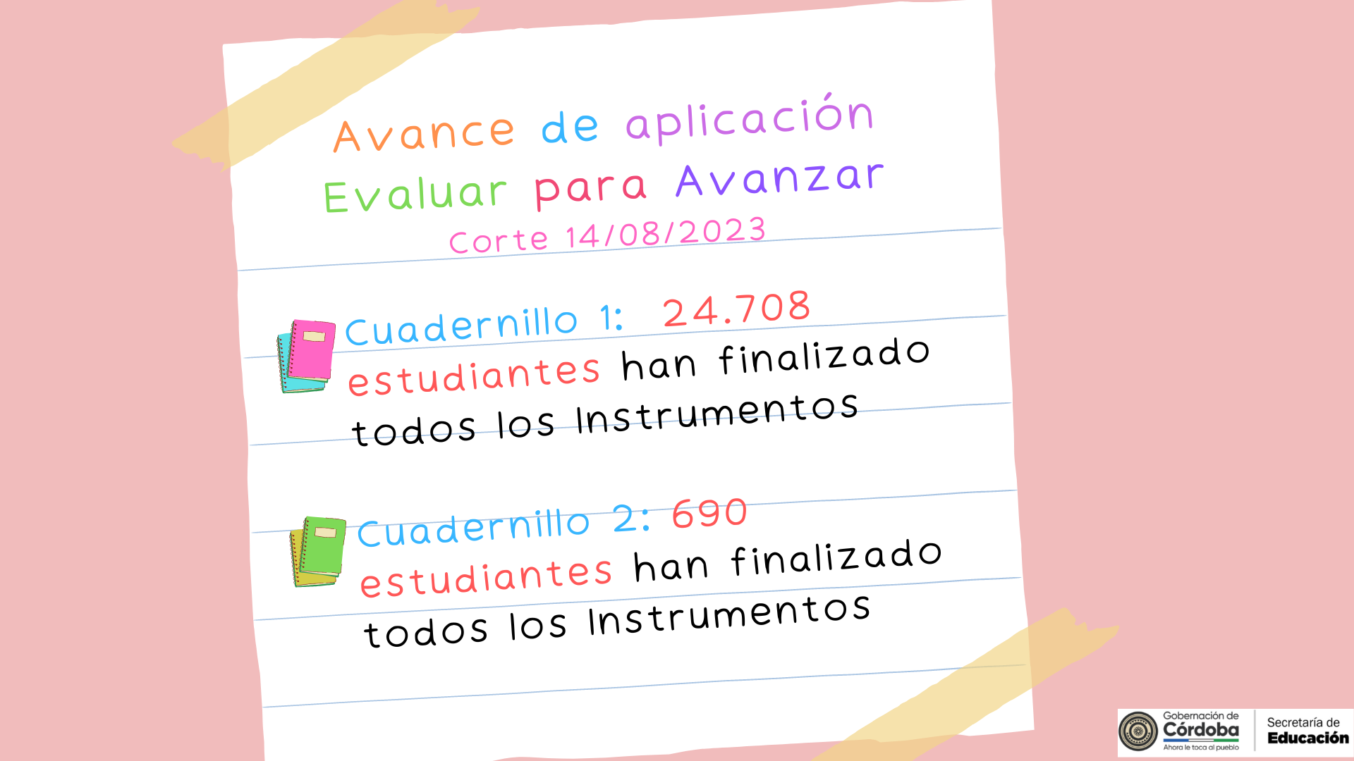En el marco de la implementación de la política Evaluar para Avanzar, la Secretaría de Educación Departamental se permite informar que a corte del 02 de agosto del año 2023 la ETC Córdoba cuenta con un porcentaje de estudiantes inscritos de 88,54 puntos, un porcentaje de docentes inscritos de 81,68 puntos, con el siguiente avance en la aplicación del primer cuadernillo, un total de 49.454 estudiantes que han finalizado al menos un instrumento de valoración y 19.565 estudiantes que han finalizado la aplicación de todos los instrumentos de valoración, frente al número de estudiantes inscritos que son 156.903, lo cual equivale a un 12,47%; y con respecto al segundo cuadernillo, el avance presentado es de 2.308 estudiantes que han finalizado al menos un instrumento de valoración y 413 estudiantes que han finalizado todos los instrumentos de valoración.