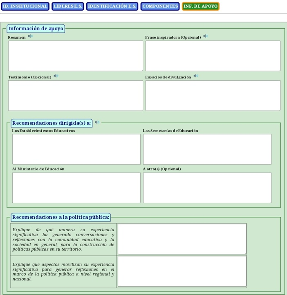 Para el caso de las imágenes, videos, audios etc. que utilice en su experiencia significativa adicionales al texto, se sugiere que las publique en una carpeta compartida de su cuenta de google drive (gmail), de manera que indique los enlaces (url) de las mismas en los puntos donde haga referencia a ellas; es decir, en los campos relativos a las pestañas de COMPONENTES (Problema, Objetivos, Fundamentación etc.) y/o de INFORMACION DE APOYO (Resumen, Testimonios, Espacios de Divulgación etc.) según sea el caso