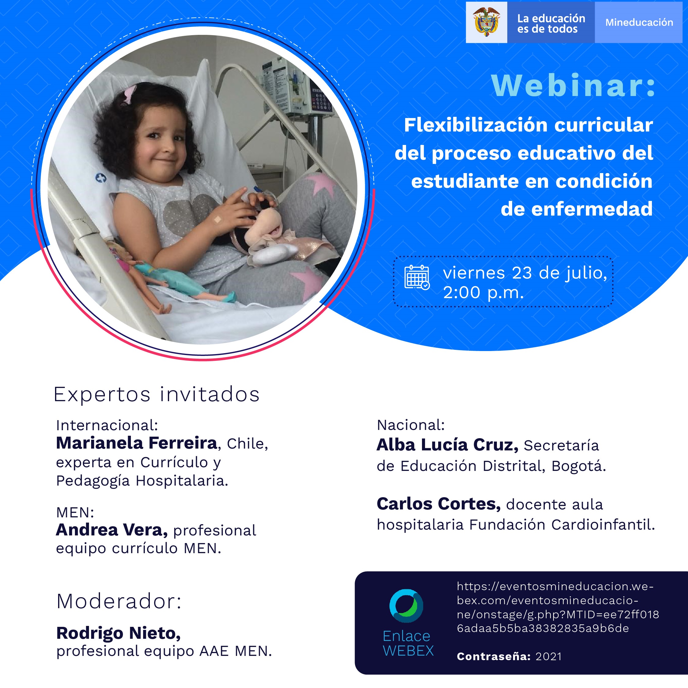 Enlace de ingreso por Webex para invitados: https://eventosmineducacion.webex.com/eventosmineducaciones/onstage/g.php?MTID=ee72ff0186adaa5b5ba38382832a9b6d - Contraseña Invitados: 2021