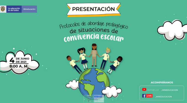 Compartimos la invitación a la presentación a este espacio que busca hacer visible a las comunidades educativas del país y a los Comités Territoriales de Convivencia Escolar, los avances en materia de convivencia escolar y en particular el SIUCE, los nuevos protocolos de abordaje pedagógico de situaciones de riesgo para el desarrollo integral en el marco de la Ruta Integral de Atención de Convivencia Escolar y el kit de herramientas de convivencia escolar. Esperemos nos puedan acompañar este 4 de junio por las redes del MEN y que nos ayuden a difundir con los docentes, directivos docentes y la comunidad educativa en general.