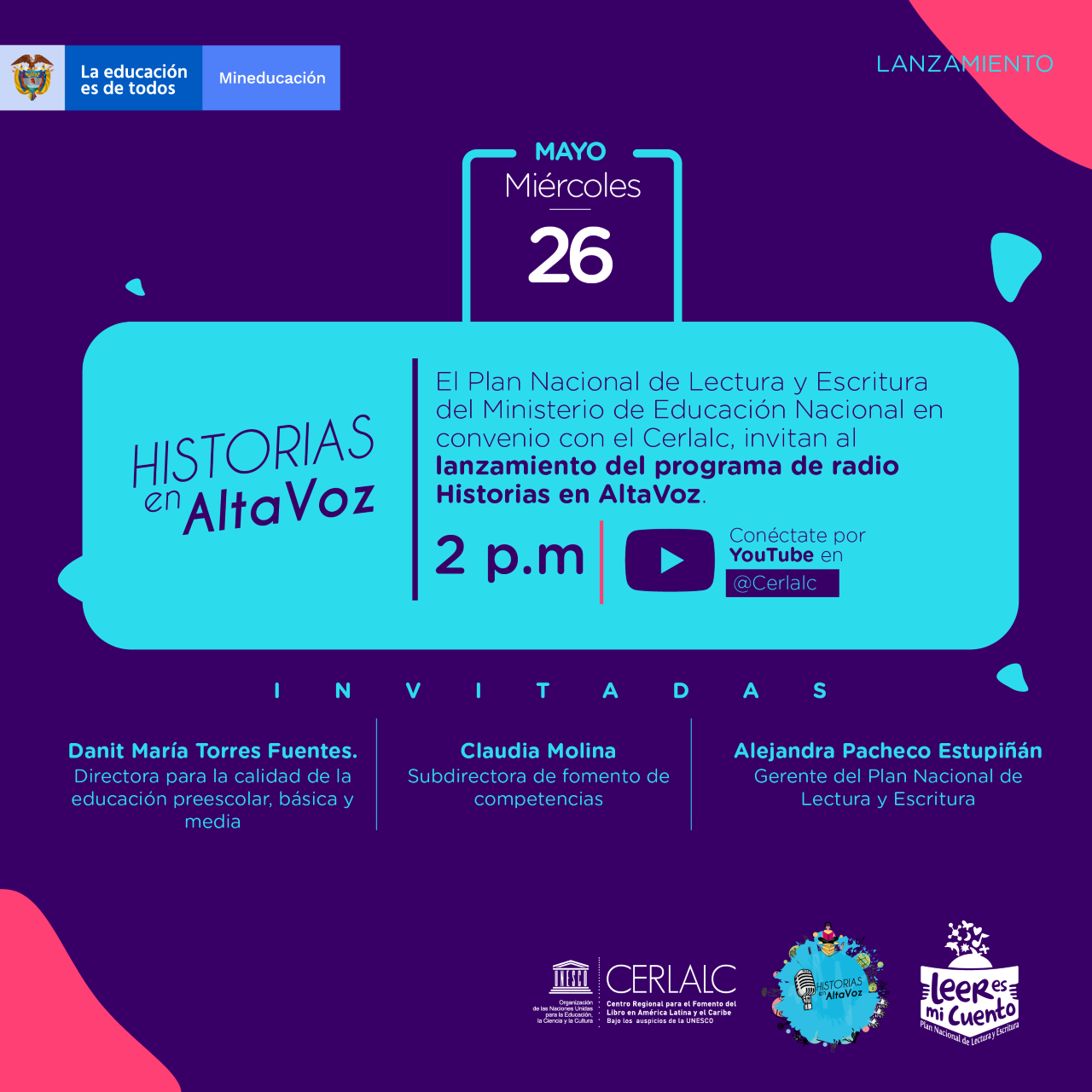Adicionalmente, el próximo 26 de mayo a las 2:00 p.m. se realizará el lanzamiento de ‘Historias en Altavoz’ donde podremos disfrutar de lecturas en voz alta, invitados especiales y las historias que se tejen cuando nos acercamos a los libros y la literatura. La transmisión se realizará en https://youtu.be/uAi-Pkzi_vY