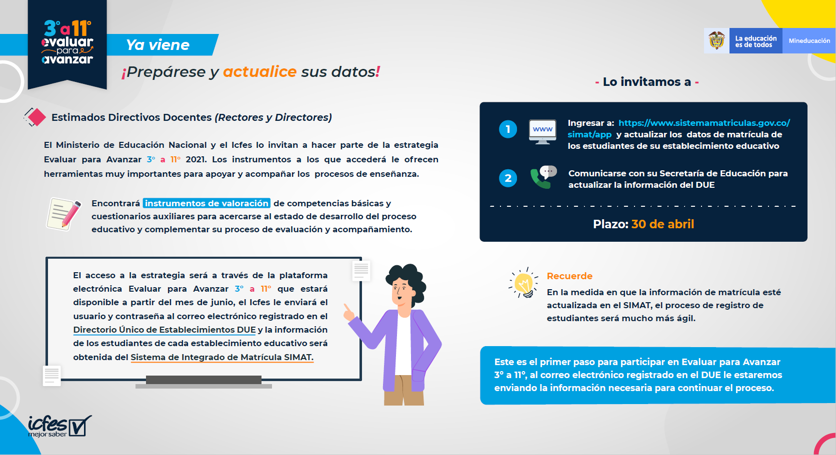 De conformidad a la Resolución No. 000090 de 2021. “Por la cual se establece el calendario 2021 de algunos exámenes de Estado 2021, y que la etapa para el registro ordinario de los estudiantes inició el 26 de abril y finaliza el 26 de mayo de 2021, y con el fin de que no se presenten inconvenientes antes el ICFES, reiteramos la petición la petición de Actualizar en el SIMAT todos los datos y documentos de los estudiantes del grado 11.