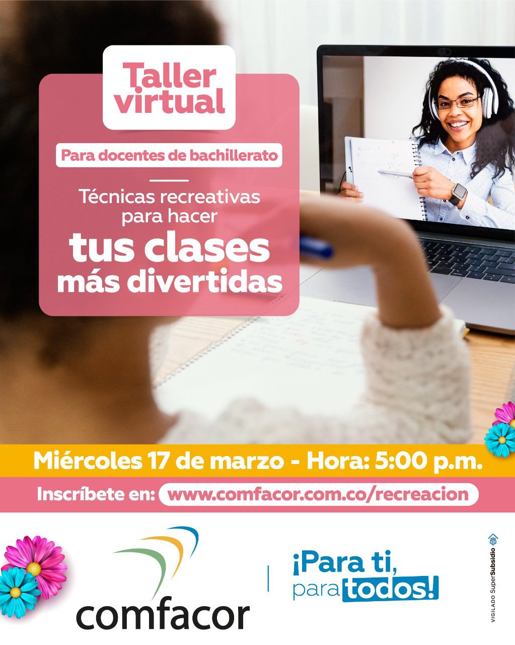 Comfacor le invita a hacer parte del taller “Técnicas recreativas útiles para docentes de bachillerato, que realizaremos el día 17 de marzo desde las 5:00 PM, por la plataforma Zoom, el cual será dictado por el experimentado recreacionista HERNANDO MAUSSA
