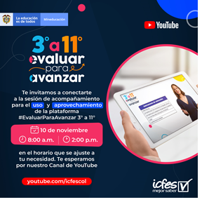 El Ministerio de Educación Nacional y el Icfes, lo invitan a participar y socializar los próximos espacios de divulgación de la estrategia Evaluar para Avanzar 3º a 11º; para la presente semana los siguientes: