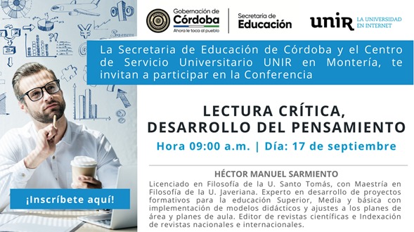 En aras de continuar llevando una labor de calidad a toda la comunidad educativa del Departamento de Córdoba y creyendo firmemente que los actores educativos hacen parte fundamental del crecimiento y el desarrollo de la región y por ende de nuestro país, la Secretaría de Educación Departamental en convenio con la Fundación Universitaria Internacional de la Rioja – UNIR, los invita a la capacitación en LECTURA CRÌTICA, DESARROLLO DEL PENSAMIENTO.