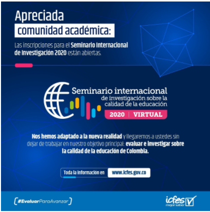 Bogotá, 2 de septiembre - El Instituto Colombiano para la Evaluación de la Educación –Icfes- no se detiene y el 5 y 6 noviembre desarrollará, como es habitual, el Seminario Internacional de Investigación sobre la Calidad de la Educación en su edición especial 2020 que se ofrecerá en su totalidad de forma virtual.