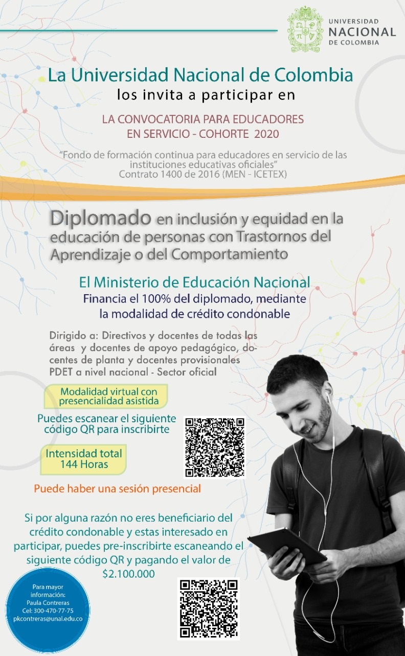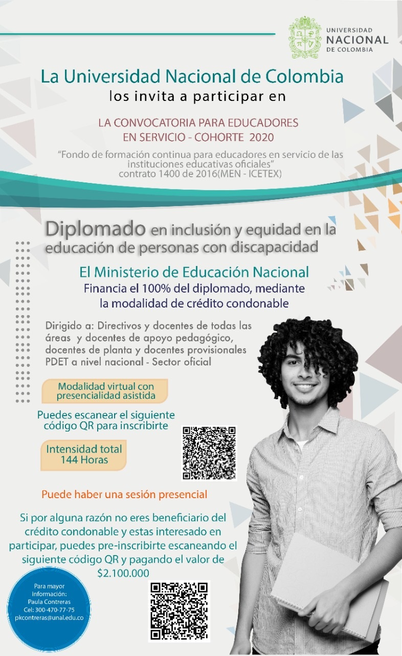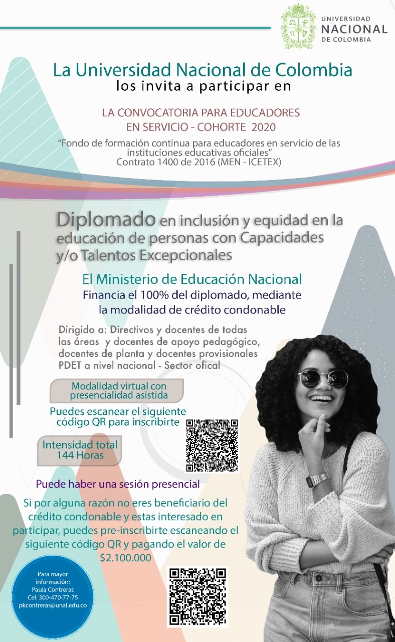 Gracias a una alianza entre Ministerio de Educación y el ICETEX La Universidad Nacional de Colombia en el marco de la convocatoria para educadores en servicio – cohorte 2020 del Fondo “Formación continúa para educadores en servicio de las instituciones educativas oficiales” ha diseñado tres diplomados virtuales, ofertados a directivos docentes, docentes de todas las áreas, docentes de apoyo pedagógico, docentes de planta y docentes provisionales PDET (Municipios priorizados Post Conflicto) de preescolar, primaria, básica y secundaria de instituciones educativas públicas de todo el territorio nacional, mediante la modalidad de crédito condonable, tal como lo indica la circular adjunta.
