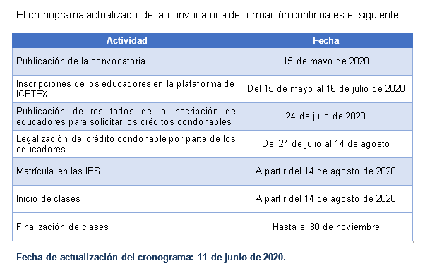 En la Circular 000113 del 04 de junio de 2020, se les presentaron las tres (3) convocatorias de formación continua que ofrece el Ministerio de Educación Nacional, como estrategia para el desarrollo profesional docente para educadores al servicio de los establecimientos educativos del país, dentro de las cuales se encuentra la FORMACION A NIVEL DE DIPLOMADOS (ACTUALIZACIÓN PEDAGÓGICA, EVALUACIÓN Y SISTEMATIZACIÓN Y LIDERAZGO DIRECTIVO) PARA EDUCADORES EN SERVICIO — COHORTE 2020.