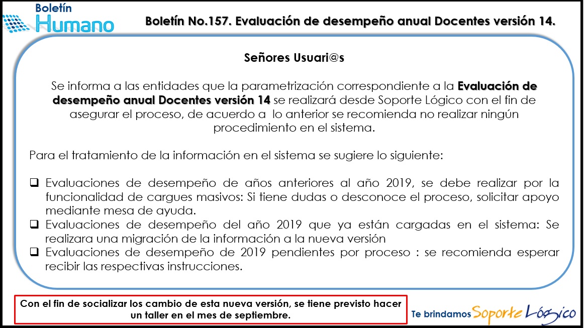 Por lo anterior se les recuerda la obligatoriedad de realizar la evaluación del primer semestre del año 2019, para los funcionarios a su cargo inscritos en carrera administrativa en el aplicativo colgado en la página de la CNSC https://www.cnsc.gov.co/index.php/56-evaluacion-del-desempeno-laboral, al cual puede acceder con su contraseña, para los funcionarios en provisionalidad deberá diligenciarse en el formato utilizado anteriormente.