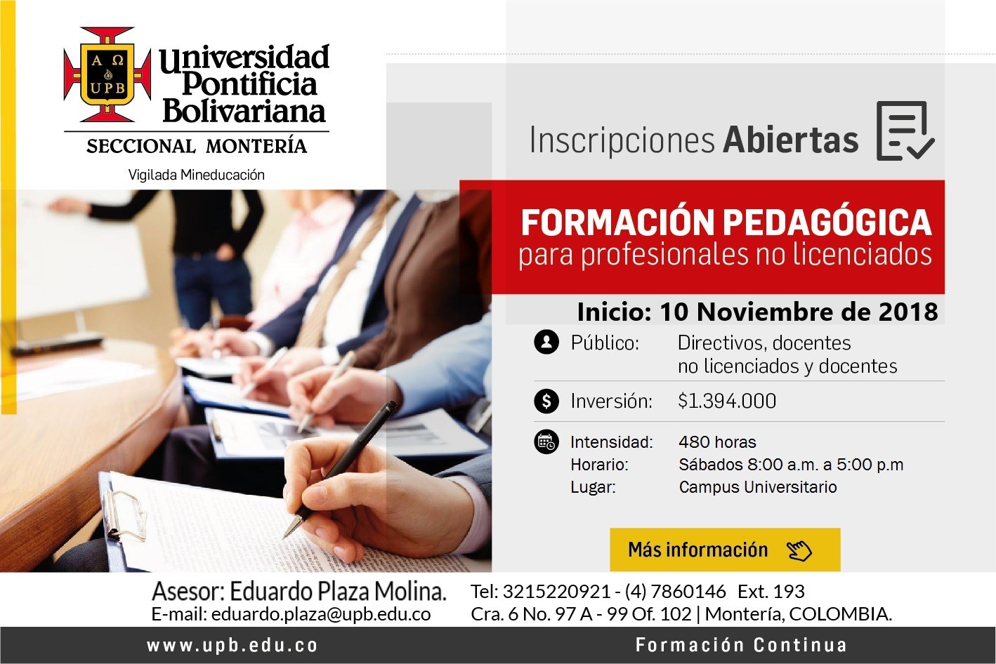 La Universidad Pontificia Bolivariana tiene abierta la convocatoria para el diplomado de formación pedagógica para profesionales no licenciados, las personas interesadas pueden comunicarse con Eduardo Plaza al celular 3215220921 - 3118010338 o al correo eduardo.plaza@upb.edu.co.