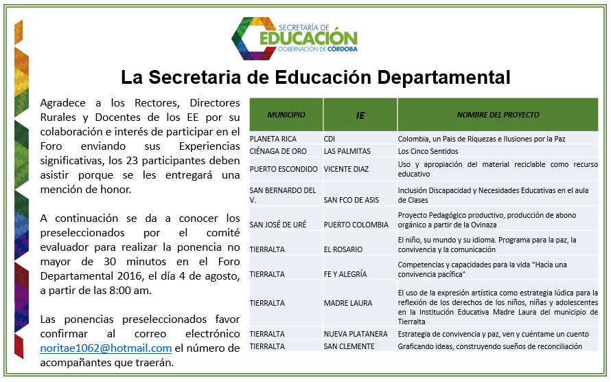 La Secretaría de Educación Departamental, Invita a participar a los Rectores, Directores Rurales, Docentes y padres de familia de las colegios públicas o privadas de Córdoba a través de un Concurso de Dibujo dirigido a niños entre 4 y 12 años de edad para que Pinten una Colombia en PAZ, nuestras familias, nuestros amigos, la recolección y el perdón.