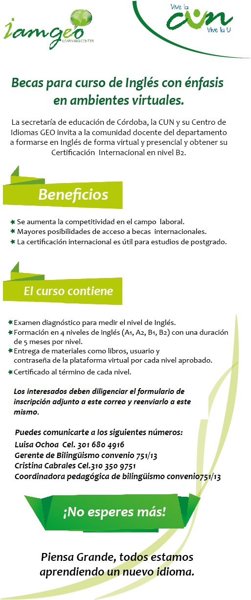 La Secretaria de Educación Departamental Informa a los Directores Rurales, Rectores de los Establecimientos Educativos de los municipios no certificados de Córdoba y Docentes en general que están abiertas las becas para el curso de Inglés con énfasis en ambientes virtuales totalmente gratis, la convocatoria estará abierta hasta el 31 de octubre de 2015, ver archivos anexos.