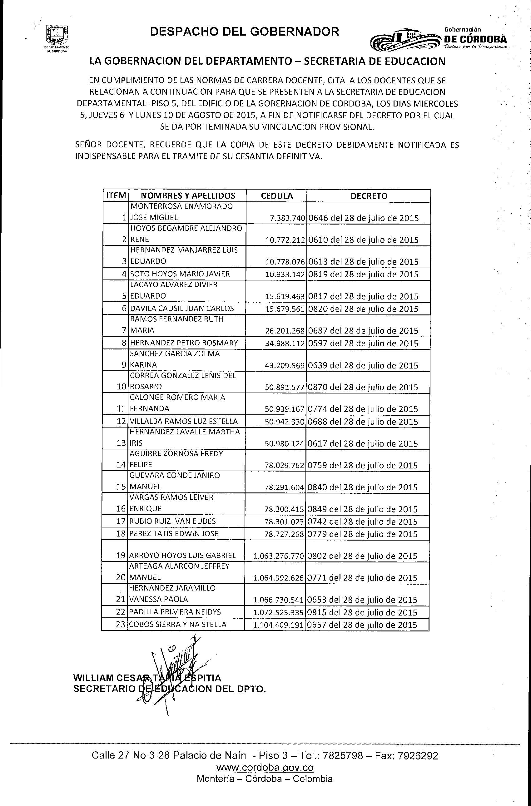 La Secretaria de Educación Departamental Cita a los Docentes de las listas anexas para que se presenten a la Secretaria de Educación Departamental piso 5 del edificio de la Gobernación de Córdoba, con el fin de notificarse del Decreto por el cual se da por terminada su vinculación provisional.